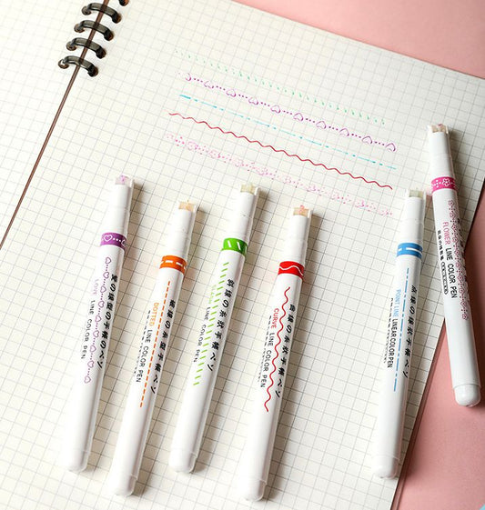 6色缐狀滾輪印章 熒光筆 彩色手賬曲線筆 花型波浪線手賬筆 標重點字 螢光筆