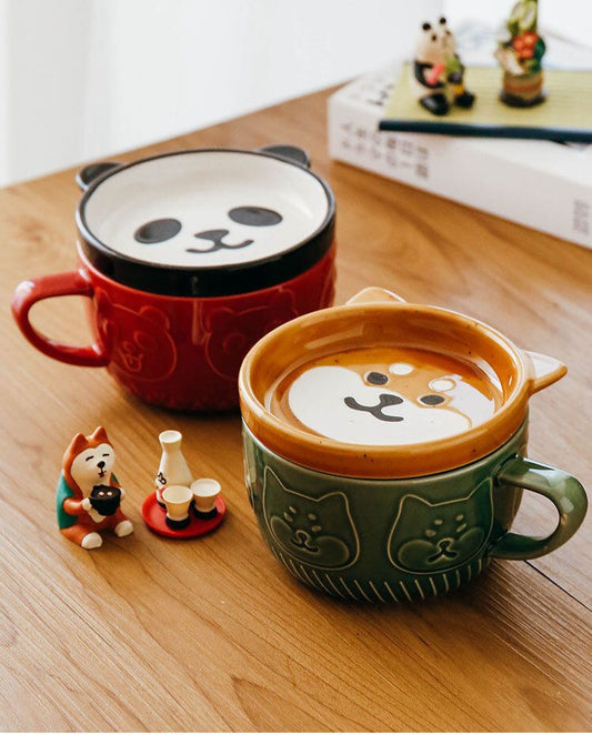 日式柴犬陶瓷杯 帶蓋咖啡杯 一物三用杯蓋小碟子杯墊 家用日系卡通寵物動物馬克杯 情侶水杯 牛奶杯 早餐杯