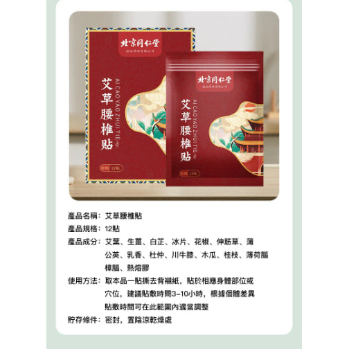 同仁堂艾草腰椎貼 1盒12片 平行進口貨品 按摩關節熱敷 去風除濕 驅寒祛濕貼 溫灸貼 艾灸貼 暖包暖貼 發熱貼 熱舒貼