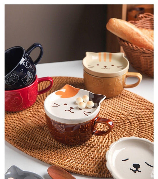 日式三色貓陶瓷杯 帶蓋咖啡杯 一物三用杯蓋小碟子杯墊 家用日系卡通寵物動物馬克杯 情侶水杯 牛奶杯 早餐杯