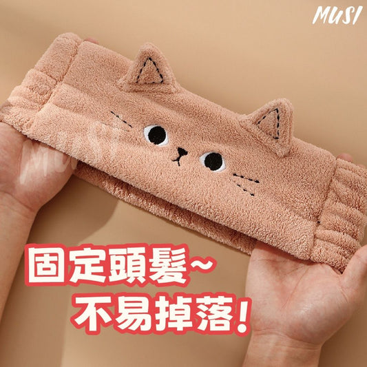 貓耳朵洗臉髮帶 洗臉束髮帶 頭髮帶 頭飾 貓咪洗臉帶 寬髮帶 彈力髮帶 卡通動物貓耳朵頭箍(淺咖)