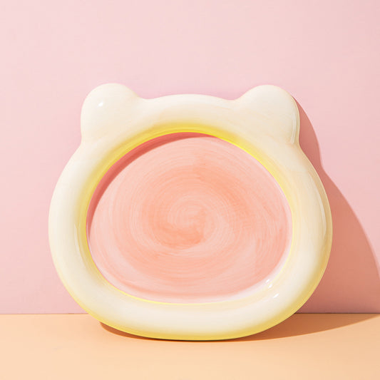 【預防黑下巴】健康手作陶瓷寵物零食碗 大平碗口防壓迫鬍鬚 防打翻 貓碗陶瓷保護頸椎大口徑 貓咪飯碗狗狗零食碗矮腳寵物碗碟(黃粉小熊款)