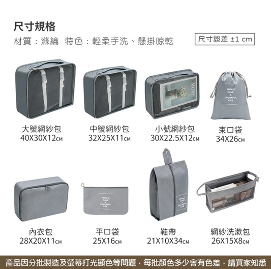 旅行收納袋 八件套 旅行袋 收納包 行李收納袋 鞋袋 旅行分裝袋 束口袋 袋子 灰色 收納袋 盒