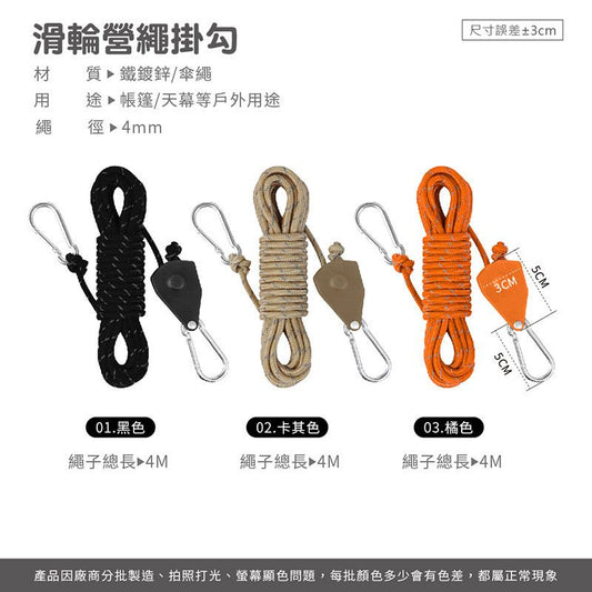 雙向滑輪營繩掛勾 滑輪營繩拉緊器 可調整營繩釦 營繩調節 天幕繩 戶外滑輪調節器帳篷固定器(卡其色)掛鉤