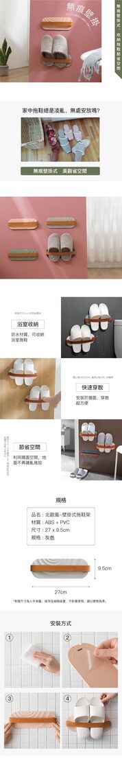 北歐風壁掛式拖鞋架|連無痕貼 黏貼安裝 防水耐淋 快速穿脫 節省空間|浴室衛浴洗手間廁所客廳玄關鞋櫃鞋盒置物架 鞋子收納神器 瀝水通風架子(灰色)