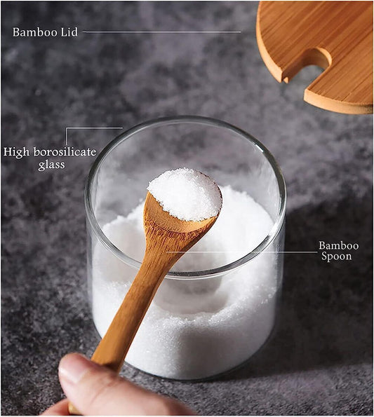 玻璃竹木調味罐組合(連蓋帶勺;3 罐裝連托盤)加厚防潮 大容量調味盒全套 日系簡約家用玻璃密封調味罐 鹽罐 廚房胡椒辣椒糖味精收納瓶罐容器 北歐香料罐套裝