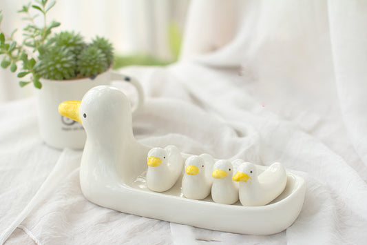 日本 Zakka 陶瓷鴨子筷子座(1托盤連5個筷子座) 一家六口親子家庭筷架 餐具雜貨 家居佈置裝飾品 家居擺件套裝 筷子架連托盤