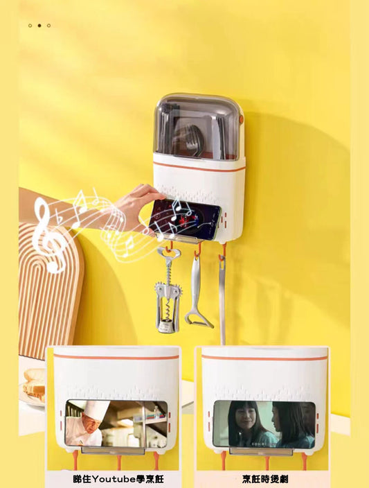 免打孔掛牆筷子收納架連可拆除掛鈎 壁掛式廚房筷子筒 有蓋筷子筒 - 白色