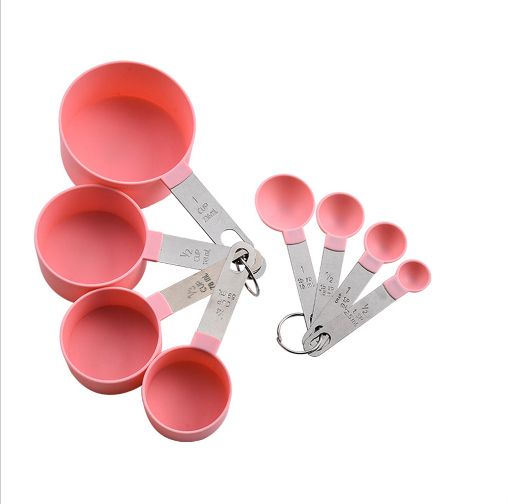 [粉色] 8件套不銹鋼手柄量杯 烘焙量匙 帶刻度塑料量杯量勺套裝