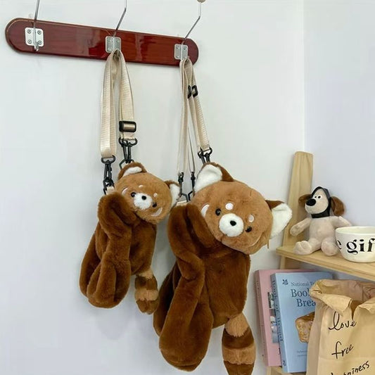 可愛小熊貓趴趴包毛絨絨可愛雙肩斜挎包 小浣熊玩偶包卡通-淺棕色 大號26*45*17cm