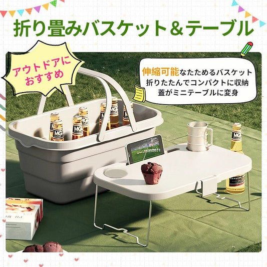 多合一!多用途日式折疊手提籃|超大容量 可變摺疊桌/砧板/儲水籃/手機支架/飲品托盤|戶外春遊露營BBQ沙灘海灘野餐野炊必備 水果飲料酒瓶汽水零食物資收納 汽車車尾箱儲物箱 春天夏秋季用野餐籃(米色)