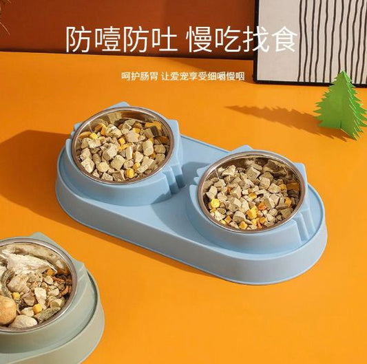 (藍色)寵物貓碗 304不鏽鋼 自動飲水 防打翻 狗狗食盆 餵食雙碗 寵物貓咪 護頸碗