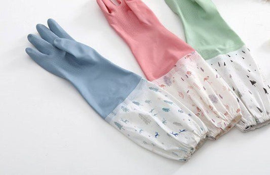 (Powder Blue) Kitchen and bathroom essential long-sleeved cuffed dishwashing gloves x 1 pair waterproof and durable household cleaning scouring pads cleaning supplies